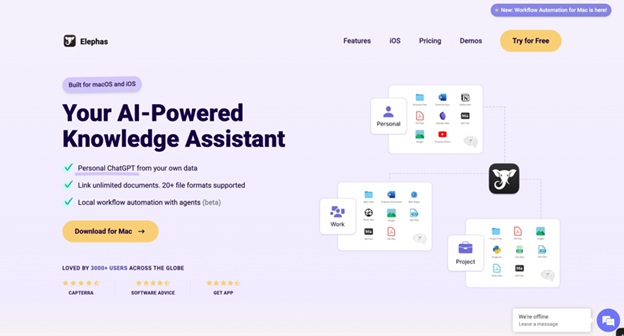 Elephas supports many different file types and connects with popular note-taking apps like Obsidian and Notion. The Smart Command feature lets you quickly search through your knowledge base and access writing tools from any app on your Mac. You can ask questions about your stored information and get help with writing tasks instantly.